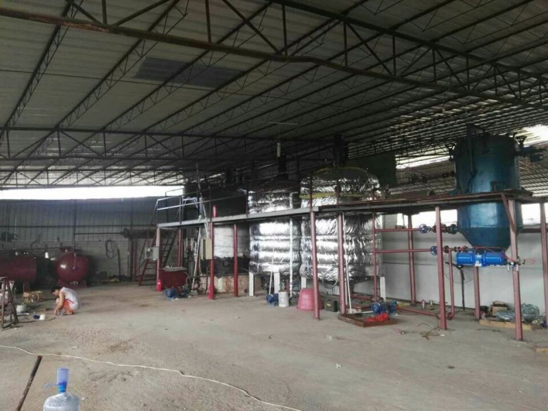 设备包括一个脱水、脱氢罐;一个脱胶罐;一个脱色罐和一个叶片过滤机组成,全部采用1.2公分钢板制造,用电或者燃烧机加热,能24小时循环连续生产。设备生产流程如下:第一步脱水脱氢:将废机油打入脱水脱氢罐中加热到150度脱水脱氢以提高闪点;第二步脱胶:待油温降到80度时打入脱胶罐中加入脱胶剂进行脱胶;第三步沉降:脱完胶质后沉降30分钟;第四步脱色:油温降到60度时打入脱色罐中加入高效脱色剂,通过过滤机过滤即成基础油,出油率高达85%以上,处理1吨废机油所用化工原料400元左右,颜色为接近水白色,油品无异味,永不氧化。
