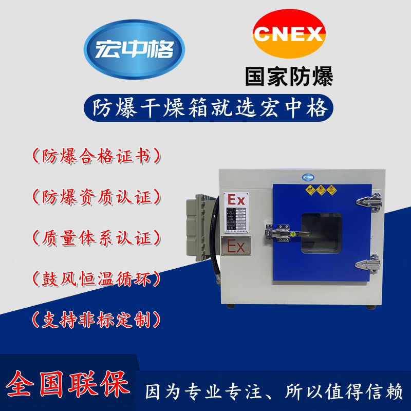 宏中格防爆烘干箱可供工厂和科研单位用于有机物烘干、预防爆炸、热处理、消毒以及加热,保温排除水份的主要设备。防爆烘箱广泛用于塑脂硬化、固化、漆包线、电机转子烘干金属工件的低温回火,退火,时效处理和热装工艺,不仅保证工件的处理质量,同时还可安全生产。
