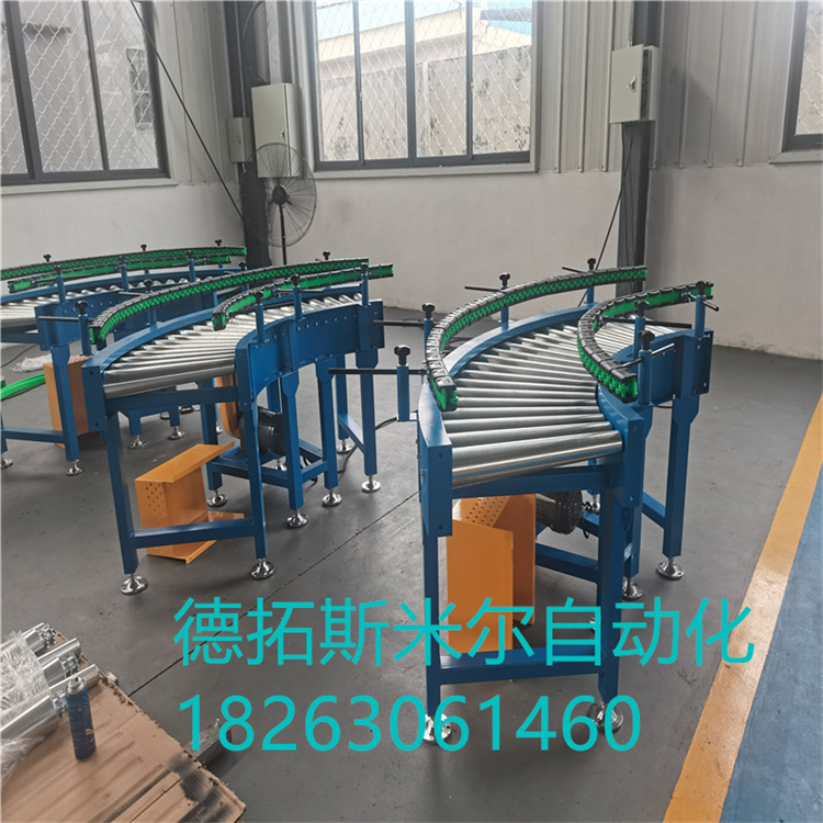 尺寸规格:滚筒输送机内宽度由客户需求制作,转弯滚线标准转弯内半径为300、600、900、1200mm等,也可按客户需求采用其它特殊规格。直段滚筒所用的滚筒直径有38、50、60、76、89mm等。转弯滚筒的锥度我们会根据输送物体的重量、外形尺寸、线速度等来设计。