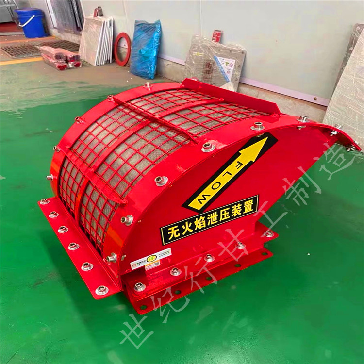 由两部分组成,防爆板和灭火模块。防爆板对爆燃压力快速升高作出反应,立即打开以减少压力。当膨胀的火球通过打开的防爆板时,被灭火模块拦截。有框架支撑的不锈钢精密网丝发挥三维火焰捕捉作用,扑灭火焰,保证火焰不被传播,进而造成二次暴炸或多次暴炸。灭火模块消除爆燃的火焰、降低热气体温度,以及捕捉通过开启的防爆板的燃烧和未燃烧的粉尘。同时,生产设备产生的压力波或噪音也会降至微小程度。火焰在通过网状阻火元件时,阻火元件与火焰进行热交换,迅速将高温火焰冷却,泄放压力和烟气,同时,生产设备产生的压力波或噪音也会降低程度。工业生产中,无焰泄暴装置与隔爆阀的组合使用不但有效防止压力波和火焰传播到上游车间的生产场地,而且遏制了二次暴炸事故的发生,降低了财产损失和保护了人员安全。