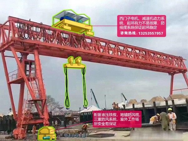 广西桂林龙门吊销售厂家生产的普通花架式门式起重机合适制梁场使用,桁架式的好处是结构简单,重量轻,便于安装维护,易拆卸,工期结束后,方便移机到下一个地方使用。