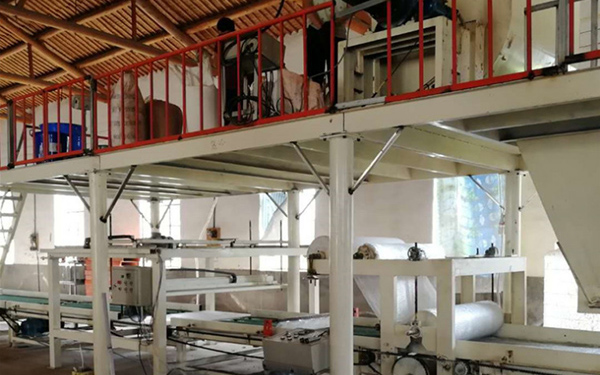 采用自动化多道辊压、布网、铺无纺布制板,一次成型,制板速度快,板材表面光滑平整,厚薄均匀,规格任意调整,具有结构设计合理、生产操作方便、成型周期短、生产效率高、产品质量好等特点。