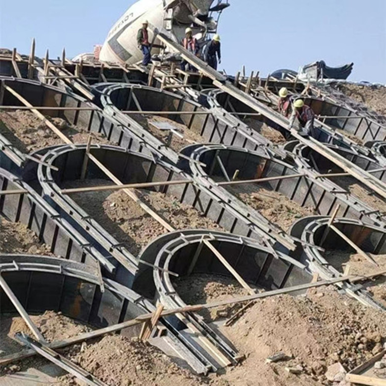 拱形骨架是一种护坡结构,由于形状为拱形,所以称之为拱形骨架,主要出现在高铁两侧的边坡防护工程,它是通过现场支模的方式来浇筑成型的。制作拱形骨架离不开拱形骨架模具,拱形骨架模具是按照拱形骨架的设计结构进行加工的,材料选用Q235钢板,经过激光切割、折弯、焊接多道工序制作成型。钢板制作的拱形骨架模具具备较高的强度,一套模具可周转500次以上,不易变形,可保障施工顺利进行。拱形骨架模具的尺寸以直径3米为标准,深度60公分为标准。当然,除了这个尺寸之外还有很多种尺寸的拱形骨架模具,如直径2米、2.5米、3.5米、4米,深度30cm、40cm、50cm、70cm、80cm,这些尺寸的拱形骨架模具也会用到,只是相对较少。这种拱形骨架模具生产出来的产品一般呈现一种拱形,拱形是在边坡中使用特别设计的一种形状,因为这种形状在实际使用的时候,各个部位受力会更加均匀,而且在一些阴雨天气,道路上的积水会随着拱形骨架流到地势比较低的地区,拱形的设计让积水不会长时间的停留在骨架上,因为是一种弧形,所以根据重力的作用,水流会形成自流,流到地势比较低的地区,这样保证路面上没有积水,保护了道路的安全,流经骨架也不会对边坡造成影响,防止滑坡现象出现。