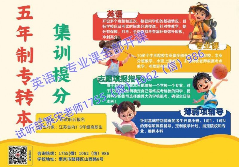 江苏瀚宣博大专转本全科辅导五年制专转本英语+2门专业课,十余年教学辅导经验,全日制上课模式,高考式复习管理,严格的上下课打卡制度,提高学员上课的积极性和主动性,拥有强大的师资力量,详细精准的内部学习资料,并有班主.任老师、教务老师、授课老师全面管理和督促,提高听课及备考效率!并以提升学员基础为目的,做到让学生轻松学,高.效学,从基础的知识点开始讲起,并通过课堂配套练习,让学员对知识的理解更加深刻,学习起来实用性更强,从而提高转本的通过率,具体课程详情及预约试听课联系宋老师1755(微)1062(信)986了解。