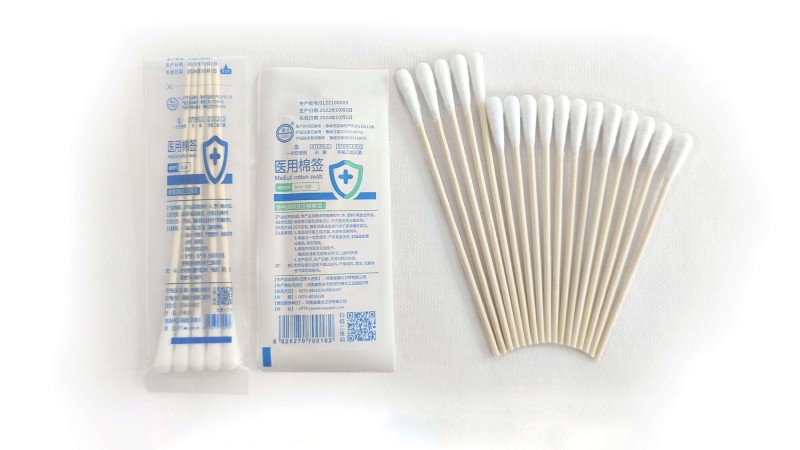 本产品为医用棉签,是一种医疗用品,广泛应用于各类医疗和卫生场所。棉签采用优质棉花和柔软、安全的塑料棒制成,棉花质地柔软,吸水性良好,塑料棒则具有足够的韧性和稳定性,确保在使用过程中不易折断或脱落。产品安全卫生,无毒无害,适用于各类医疗操作和个人清洁使用。