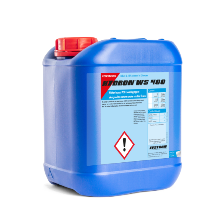 HYDRON® WS 400 是一款水基型清洗剂,特别设计用于去除电子组装件上水溶性(WS)助焊剂残留物。该清洗剂与敏感金属兼容。HYDRON® WS 400 在低浓度(3%-5%)应用时,可渗透去离子水无法达到的低底部间隙元器件的细小空隙。浓度上调至15%时,该清洗剂同样可以有效去除RMA和免洗型助焊剂残留物。