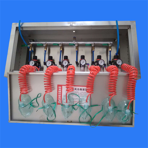ZYJ-A型矿井压风自救装置,内装六个联成一组,装在不锈钢的箱体内,组成一个井下自救系统,并由地面泵房供气。(瓦斯突出矿井安装多少个组,视其井巷规模,井下工作人员编制的多少而定,一般情况下,井下安呼吸器的个数不得少于井下全员的三分之一)。