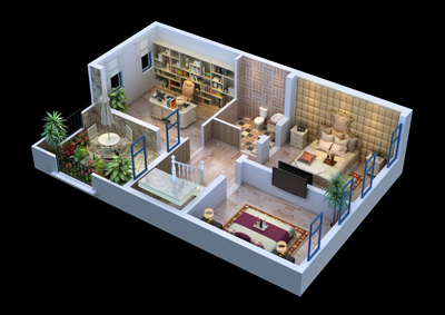 其实,在这里并非吹嘘自己工作室的绘制户型图的能力多好,而是客户的意见从侧面反映出一个问题:那就是简单的平面图已经不能满足广大购物业主判断户型结构和方案的需求,他们需要一种更立体更直观的表现方式,那就是三维立体户型图了。在开发商楼盘宣传中,一般采用1+1方式或是1+2方式。所谓的1+1方式,就是用彩平图搭配3D户型图,或是用CAD的黑白线条户型图搭配立体户型图(推荐方式,两种都直观),对于1+2方式,就是三维户型图搭配两种类型的平面图了,这个有些繁复了。