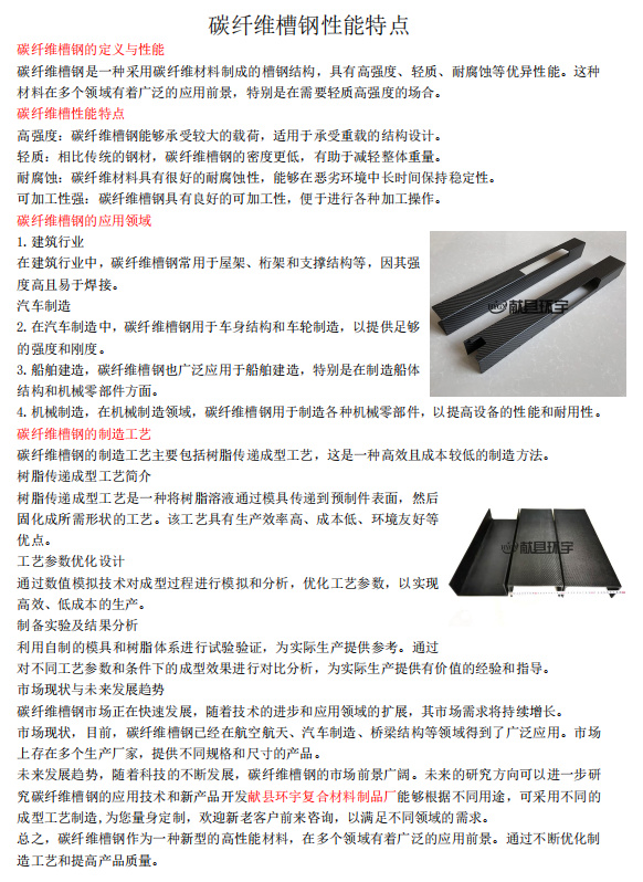 碳纤维槽钢是一种采用碳纤维材料制成的槽钢结构,具有高强度、轻质、耐腐蚀等优异性能。这种材料在多个领域有着广泛的应用前景,特别是在需要轻质高强度的场合。