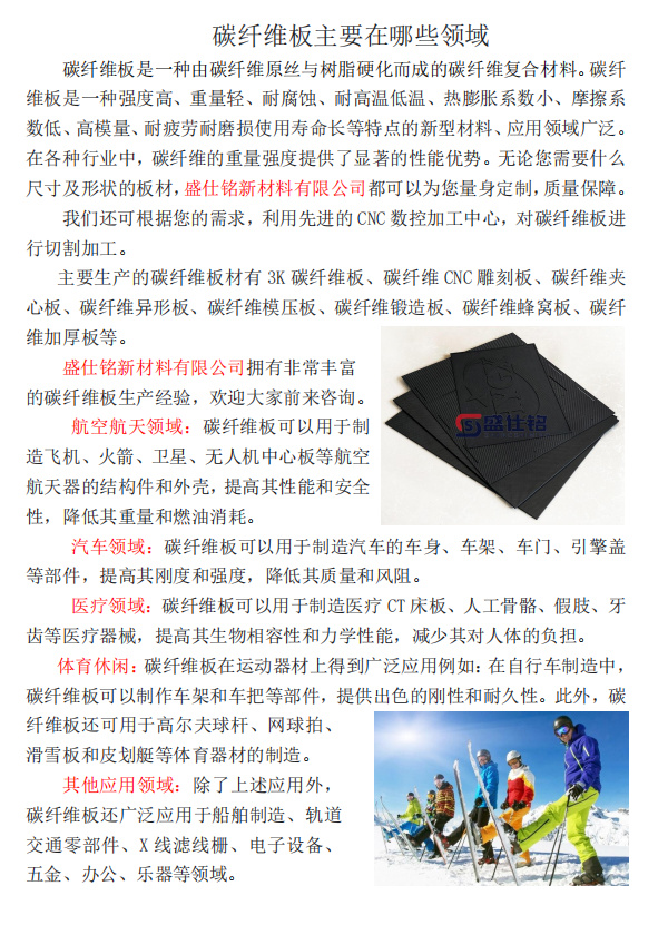 碳纤维板是一种由碳纤维原丝与树脂硬化而成的碳纤维复合材料。碳纤维板是一种强度高、重量轻、耐腐蚀、耐高温低温、热膨胀系数小、摩擦系数低、高模量、耐疲劳耐磨损使用寿命长等特点的新型材料、应用领域广泛。在各种行业中,碳纤维的重量强度提供了显著的性能优势。无论您需要什么尺寸及形状的板材,盛仕铭新材料有限公司都可以为您量身定制,质量保障。