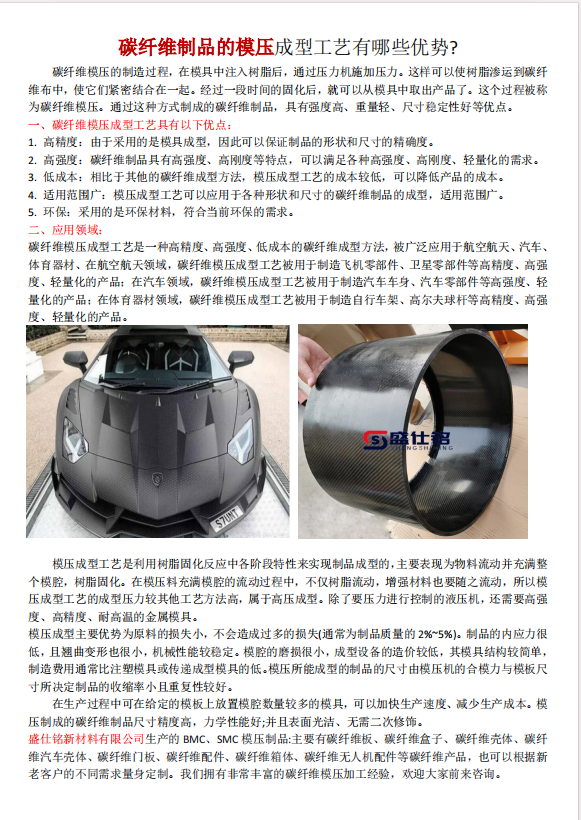 碳纤维模压的制造过程,在模具中注入树脂后,通过压力机施加压力。这样可以使树脂渗运到碳纤维布中,使它们紧密结合在一起。经过一段时间的固化后,就可以从模具中取出产品了。这个过程被称为碳纤维模压。通过这种方式制成的碳纤维制品,具有强度高、重量轻、尺寸稳定性好等优点。