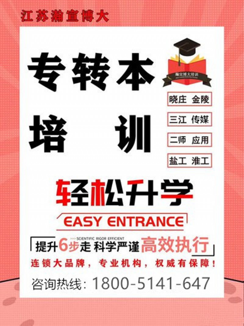 江苏瀚宣博大五年制专转本培训学校,专业从事五年制专转本辅导已有十余年,辅导英语和各主考院校所有专业课,专业的老师指导,教给考生更多的学习方式,还针对考生的个人不同基础情况指导专业的复习方式,提供更加详细精准的复习资料,紧扣大纲,涵盖考点、强化考试题型、提高解题速度、强化解题思维。全年滚动开课,可以随到随学,一对一、一对N配置,针对性强。1-5年级备考生均可报名参加,一次报名可循环上课至考前,越早报名,课时量越多,基础越扎实。更多五年制专转本备考详情联系1800微5141同647严老师,领取招生简章,预约免费试听课。目前在江苏南京、常州、苏州、无锡、南通、徐州、盐城、镇江等各大城市均设有校区,可就近选择上课地点。