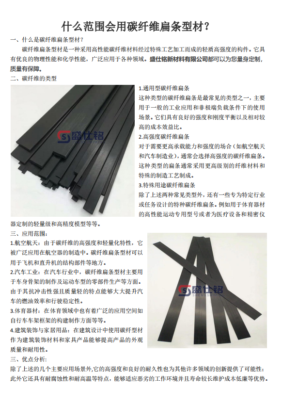 碳纤维扁条型材是一种采用高性能碳纤维材料经过特殊工艺加工而成的轻质高强度的构件。它具有优良的物理性能和化学性能,广泛应用于各种领域。