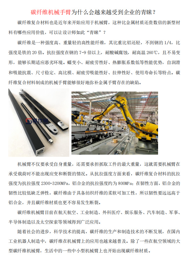 随着社会的进步,科学技术的提高,碳纤维的生产和制造技术的不断发展,在国内工业机器人制造中,碳纤维在机械臂上的应用也越来越普及。除了一些在航空领域的大型碳纤维机械臂,生活中的一些中小型机械臂上也开始出现碳纤维材质。