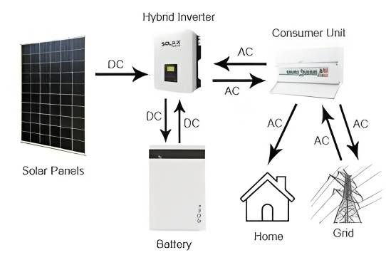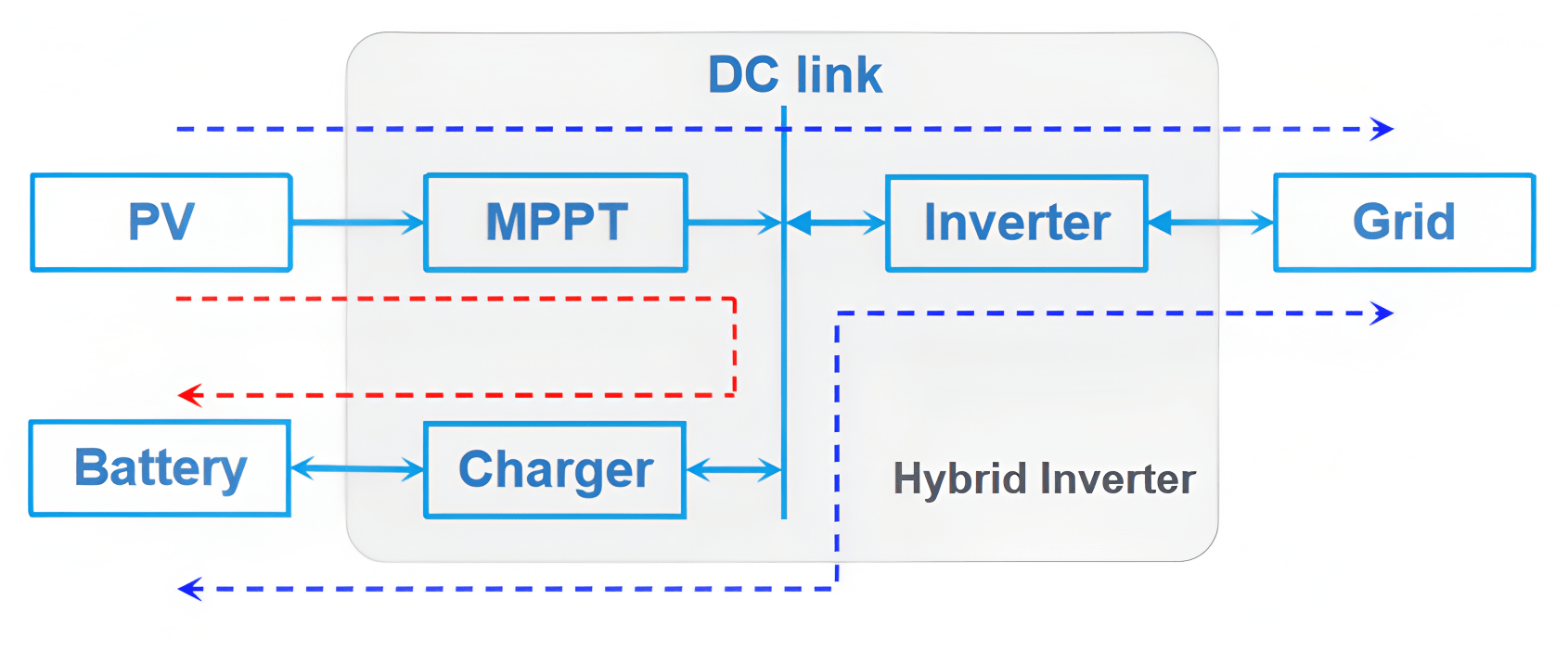 户储一体机的核心拓扑通常包含光伏输入、电池充放电管理和电网逆变三个主要功能模块。系统功率链的建议结构为:太阳能电池板 → MPPT 升压级 → 隔离式 DC-DC (DAB) → 电池组 → DC 耦合点 → 逆变器全桥 → 交流电网/负载。