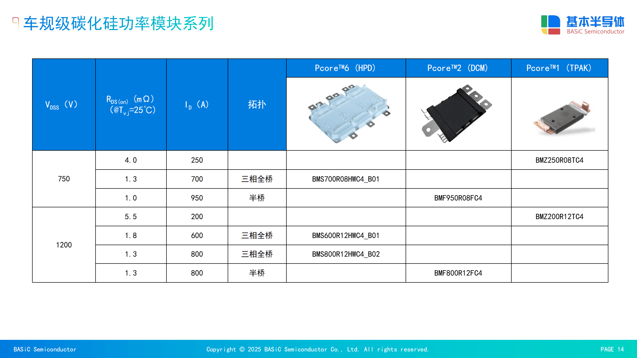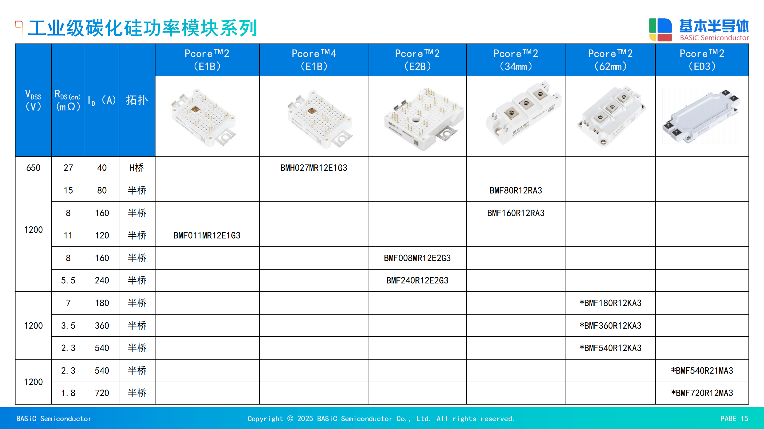 对所选用的基本半导体 (BASiC Semiconductor) SiC 器件进行关键参数汇总,为后续设计提供性能基准: