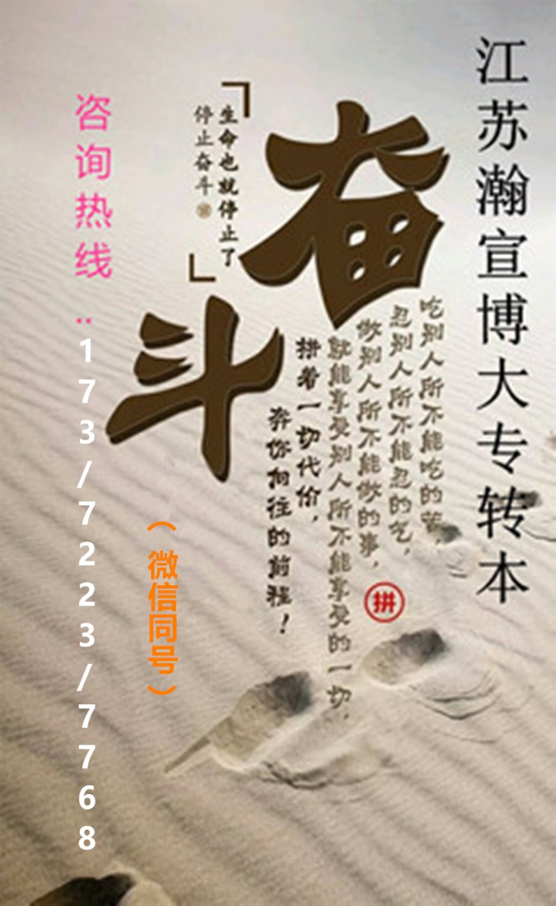 江苏瀚宣·博大学历提升深耕五年制专转本辅导已有十余年,辅导英语和各主考院校所有专业课,考虑到高职同学们底子薄弱,英语的辅导从基础开始教起,先夯实基础再提优拔高,达到快速提分的目的;专业课是根据各院校专业考纲,小班化授课,1对1、1对N,方便老师更好的管理每一位学员的蕞新学习情况,由授课老师根据考试的重难点进行针对性的辅导和查漏补缺,做到高·效辅导,让考生深刻了解五年制专转本考试的难度及侧重点。更多转本详情联系173微7223同7768严老师,预约试听课程并领取招生简章一份。同学和家长有空余时间可以先来实地考察上课环境、师资情况及录取率后再做考虑。在江苏南京、无锡、苏州、常州、镇江、南通、盐城、昆山、扬州、徐州等各个城市均开设有教学校区,面向江苏十三市五年制高职转本备考生进行招生,1-5年级考生均可报名参加,一次报名可循环上课至考前,因此,越早报名,课时量越多,基础越扎实。
