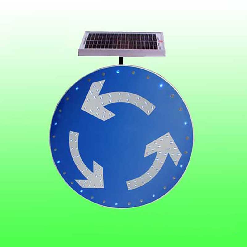 太阳能环岛标志牌是以多晶硅太阳能板、蓄电池组件为能源,它利用太阳能板将白天的阳光转换成电能贮存于蓄电池中,当夜幕降临、视线昏暗或雨雾天气等视线不佳情况下,限速标志牌上的发光二极管自动启动闪烁,通过LED发出亮光来勾画图案轮廓,传达交通信息。
